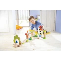 Bunte Holzkugeln, Gefälle, Tunnel und Rollbahnen auf beiden Seiten der Hape Kugelrennbahn – das ist rasanter Spielspaß! Super für die Kleinsten, denn sie können mit den Augen den rollenden Kugeln folgen.
