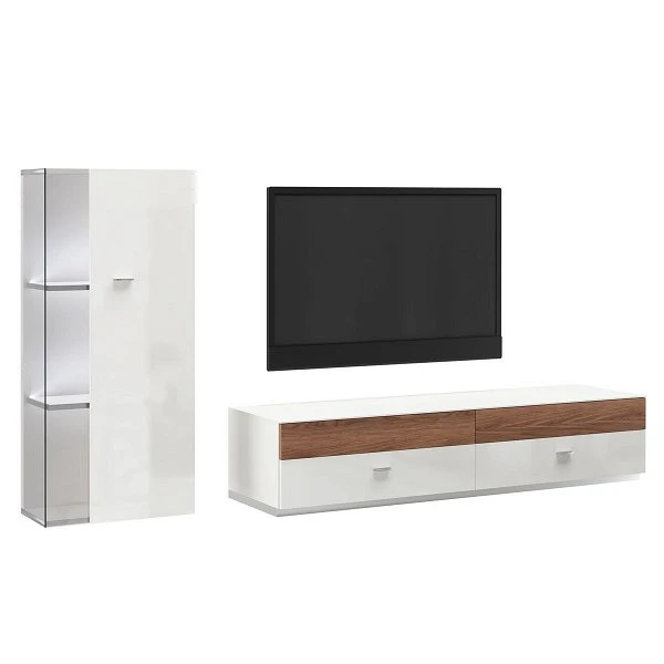 Der Korpus ist in Lack-weiß gehalten. Die Fronten sind in Lack-Hochglanz-weiß und Kernnussbaum.
