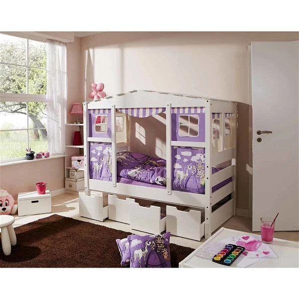 Ticaa Hausbett MINI Horse Lila Kiefer Weiß inkl. Schubkästen – Dessin: Horse Lila